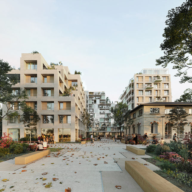 Construction de 102 logements sociaux, un CHRS, une Maison Relais et 1600m² de locaux d’activités. Construction en structure bois (R+9) avec façade auto-portante en pierre massive.